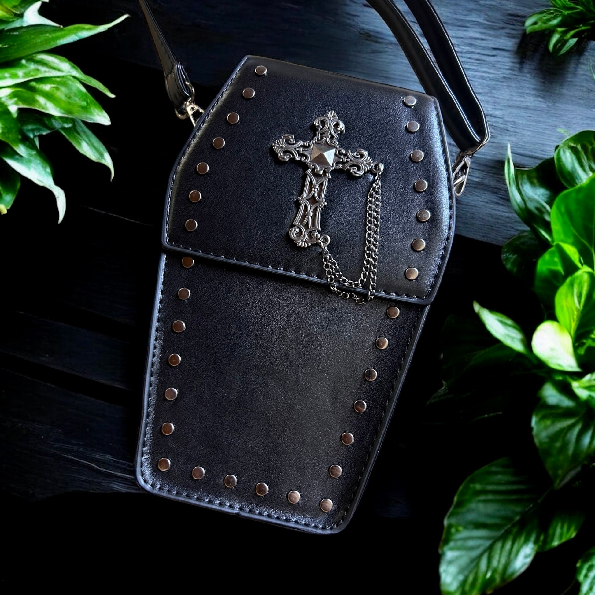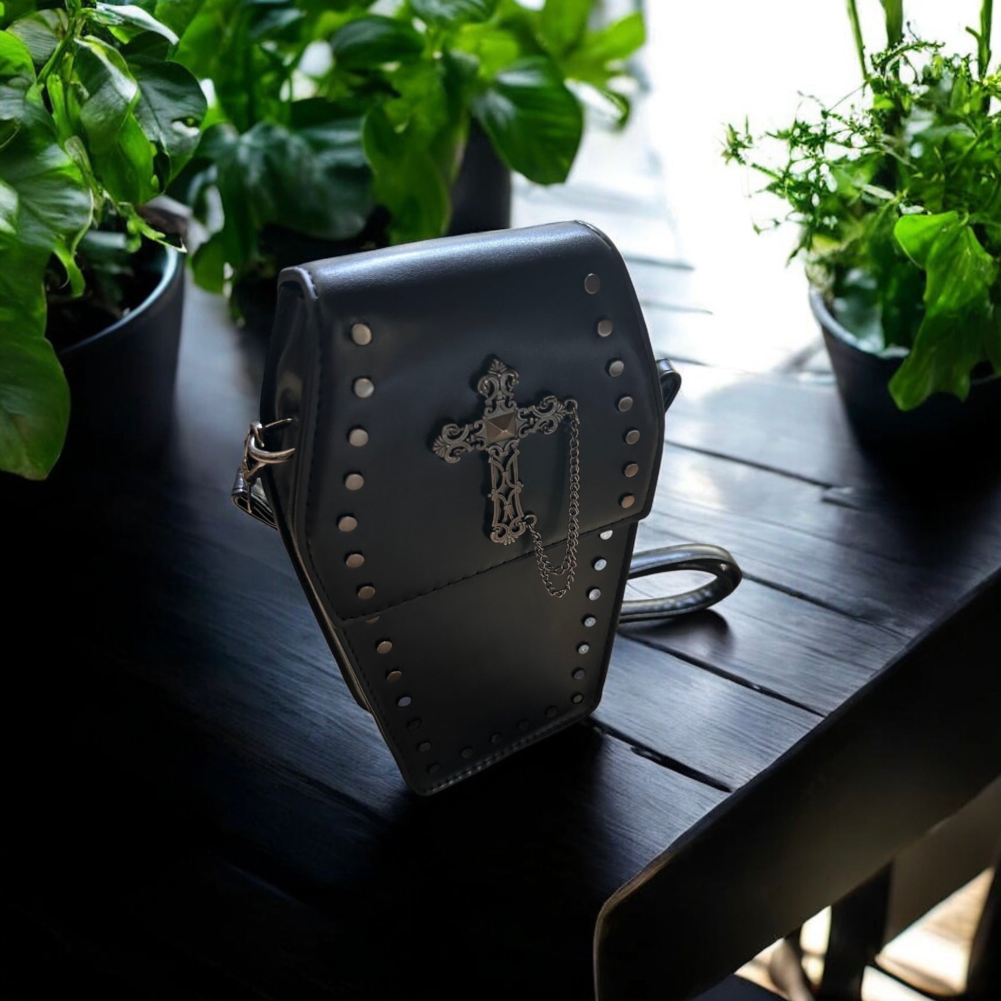 200 Gothic Coffin Crossbody Bag – Black Faux Leather with Chain