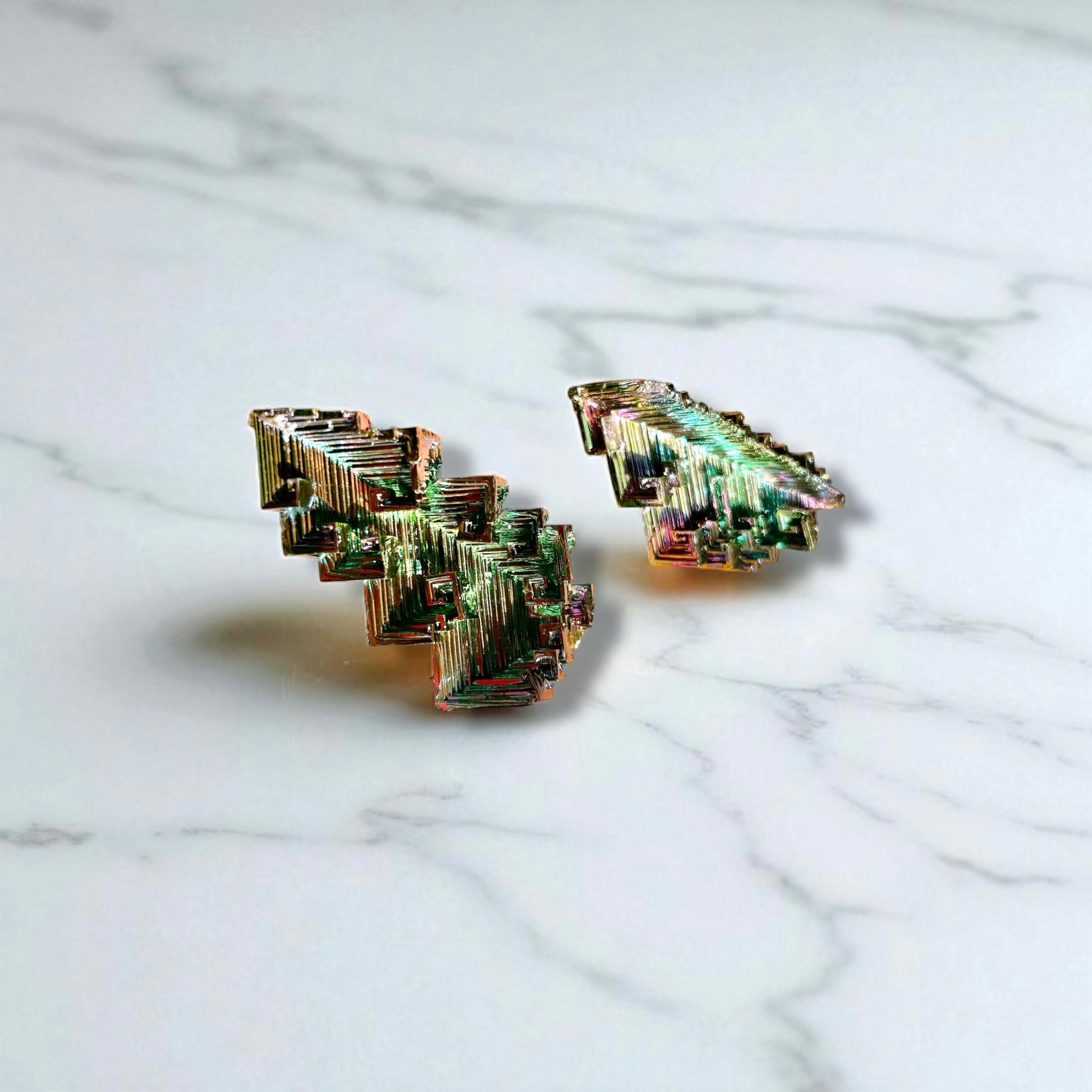 These stunning natural Bismuth crystals display a captivating rainbow of metallic colors, formed in mesmerizing step-like geometric patterns.