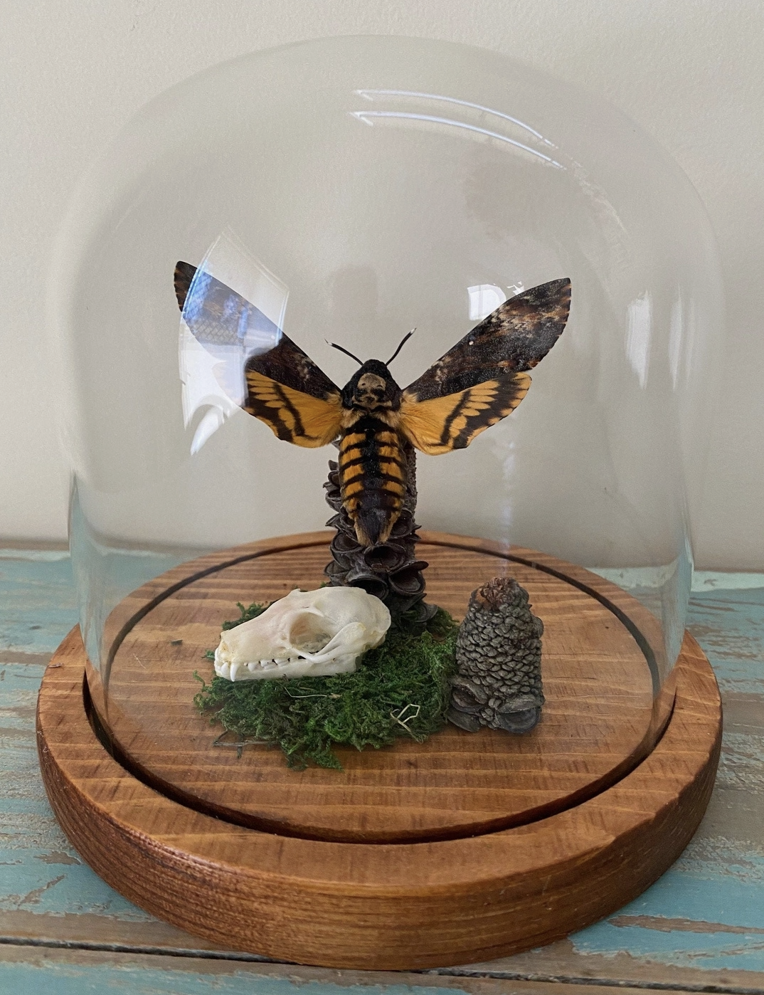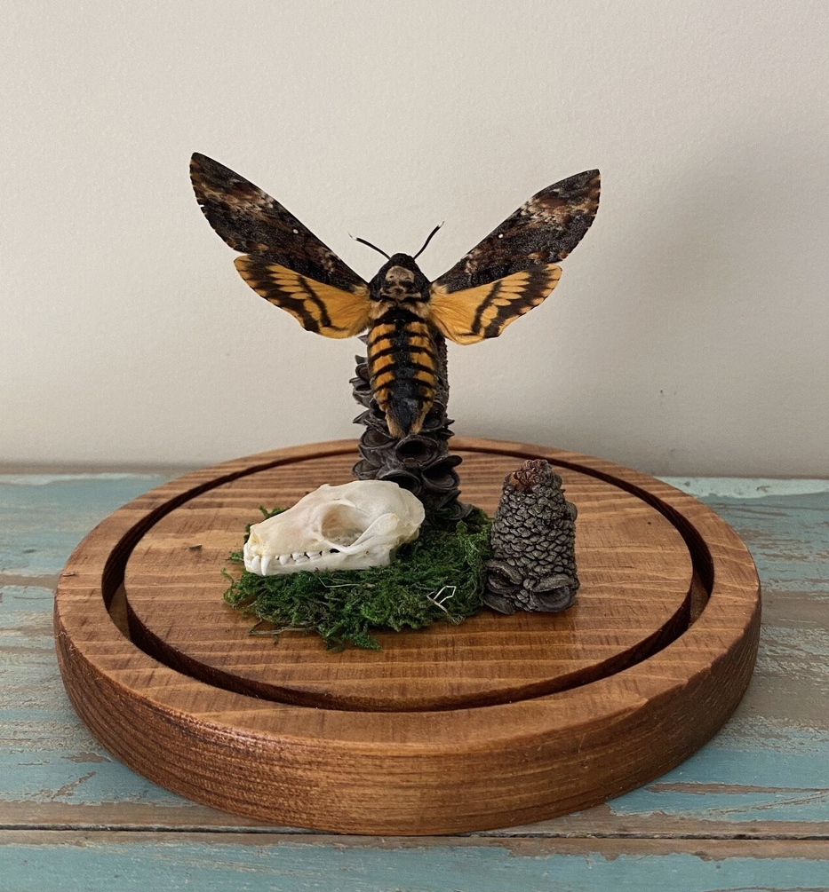 These moths are easily distinguishable by the vaguely human skull-shaped pattern of markings on the thorax. Death Head Moths have the ability to emit a loud squeak if irritated. The sound is produced by expelling air from the pharynx, often accompanied by flashing of the brightly colored abdomen in a further attempt to deter predators. These are commonly observed raiding beehives of different species of honey bee for honey. They can move about in hives without being disturbed because they mimic the scent of the bees.