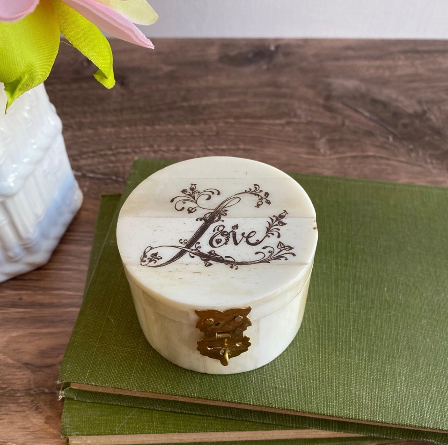 This elegant bone ring box is elegantly engraved with the word "Love." This could be used as a unique gift box for an engagement, anniversary, birthday, Valentine's Day or Mother's Day ring or earrings.