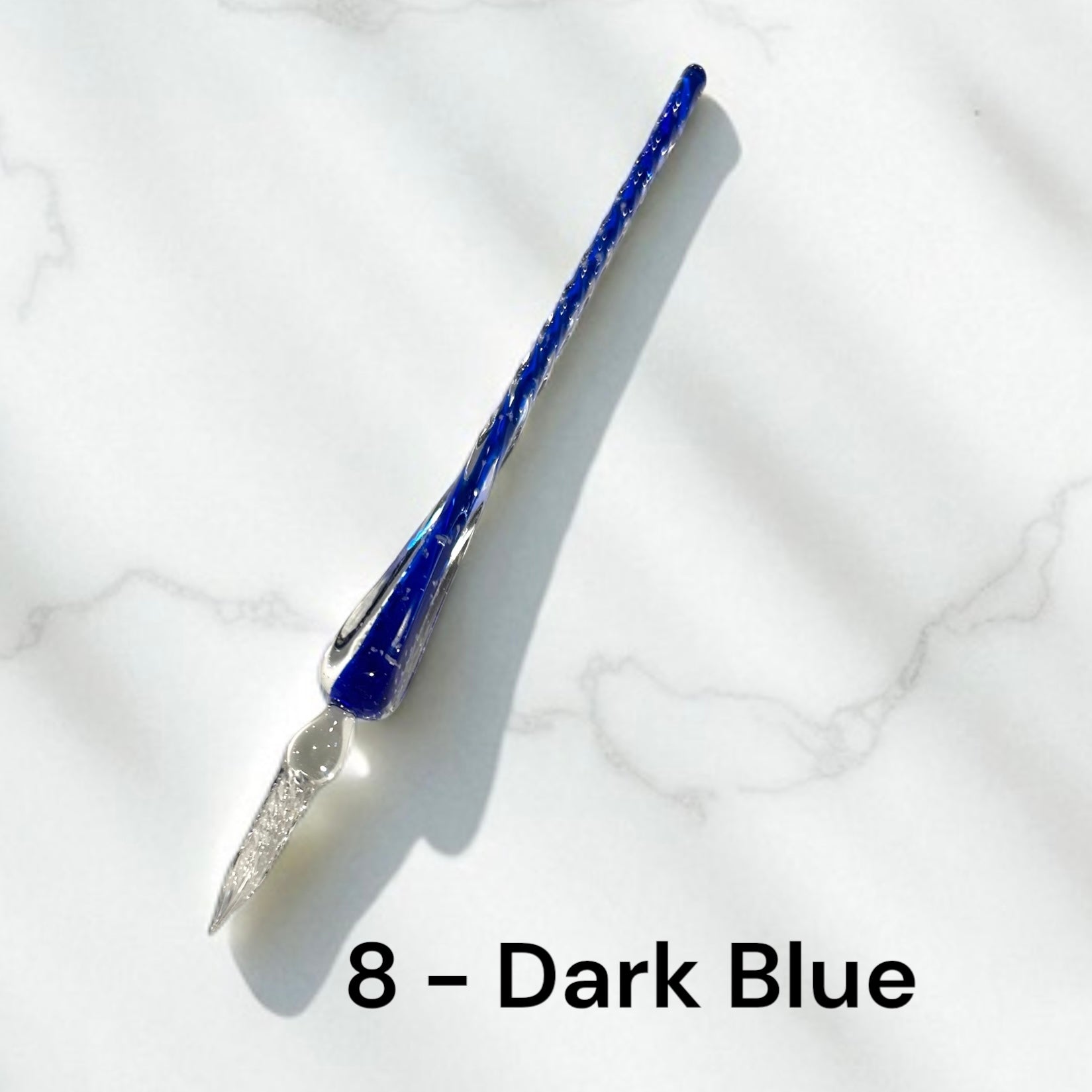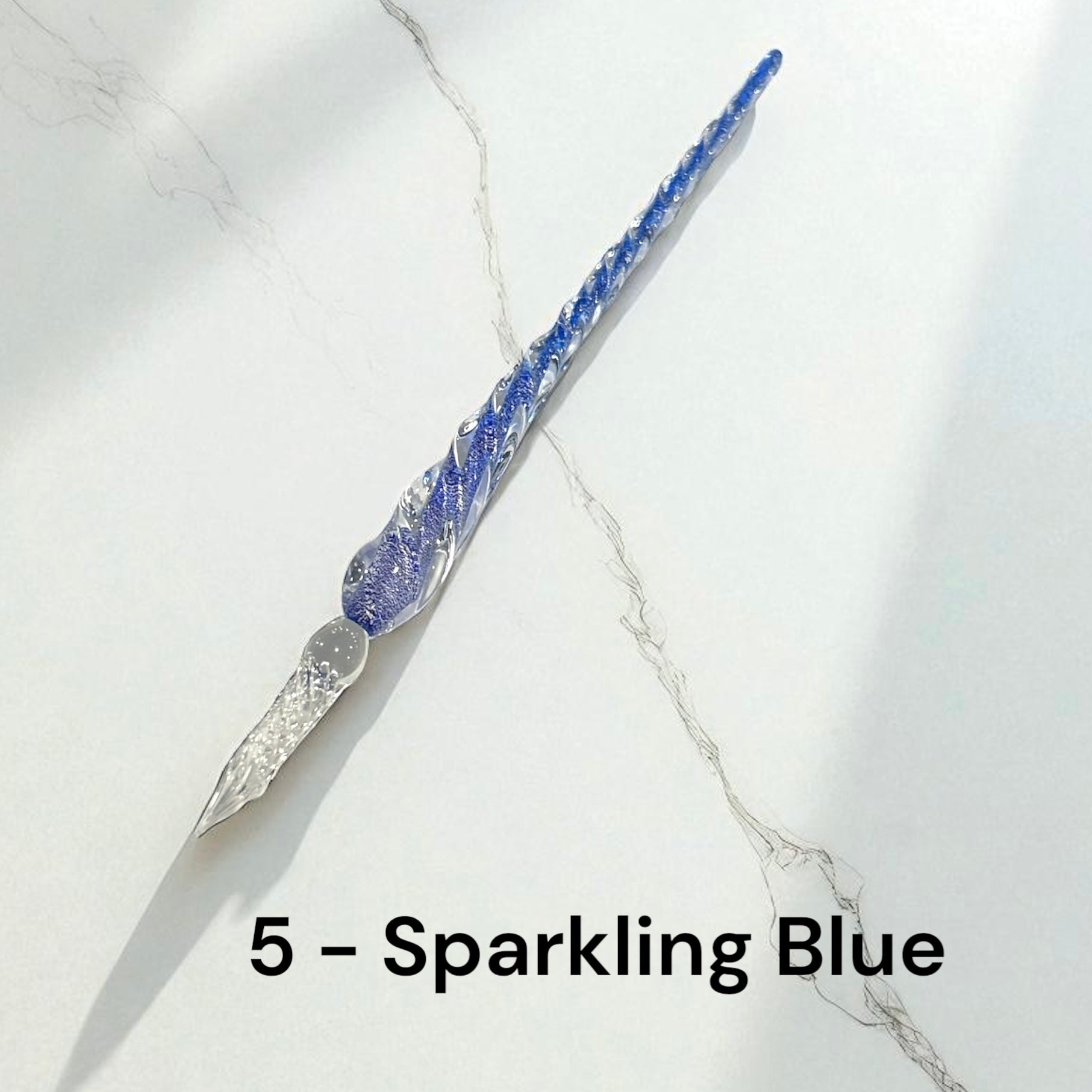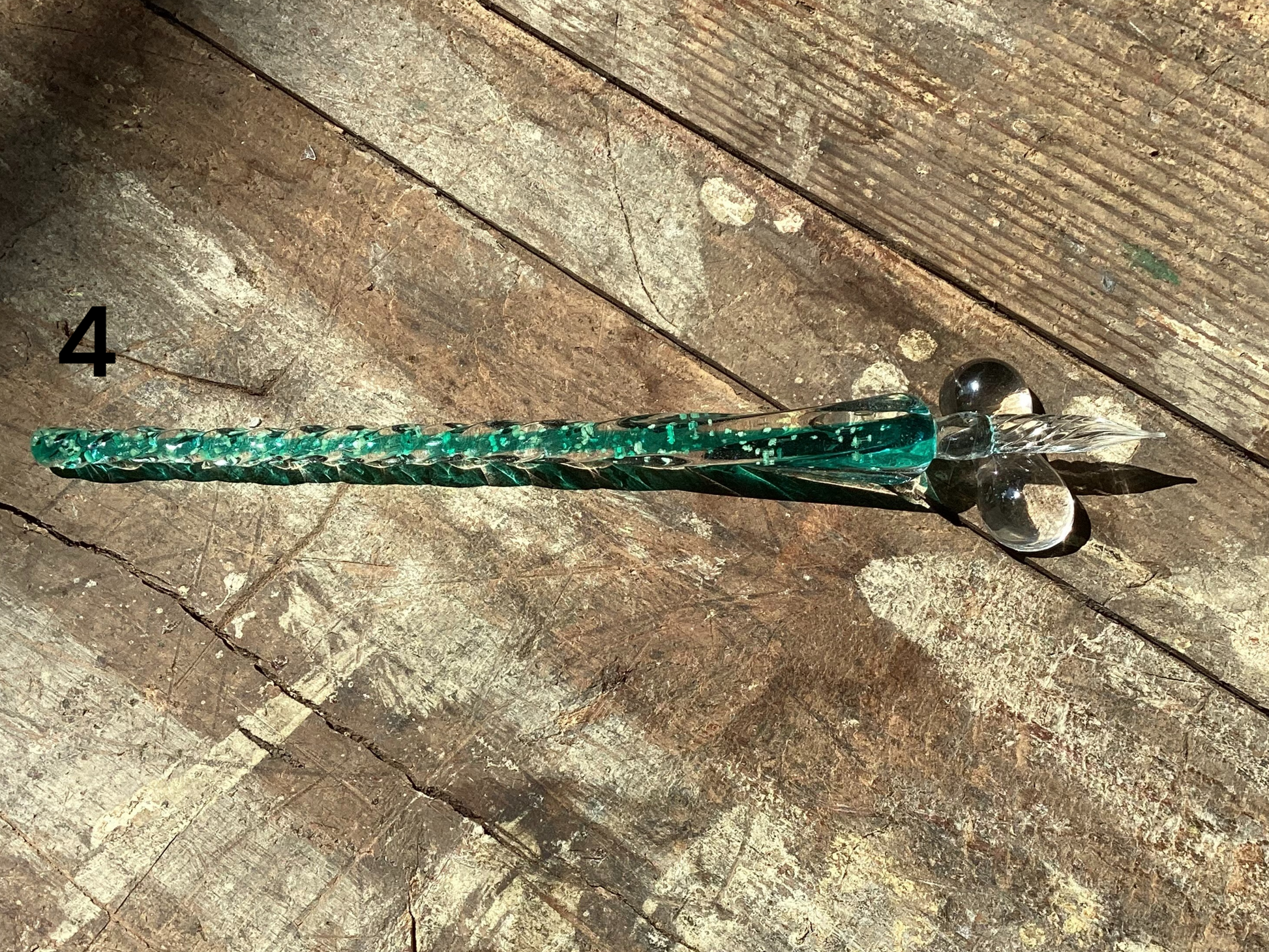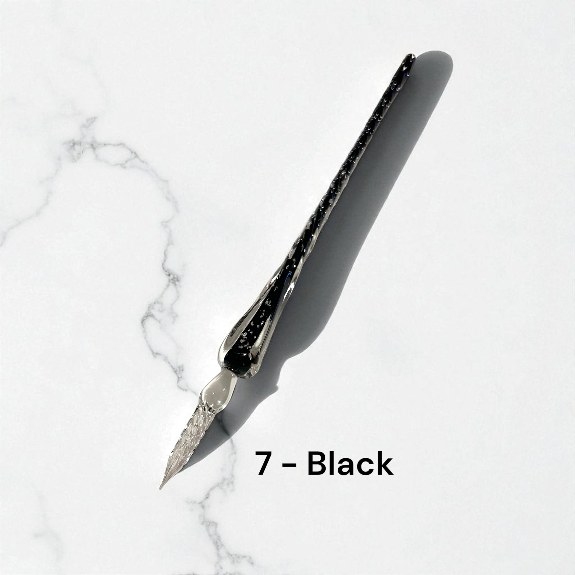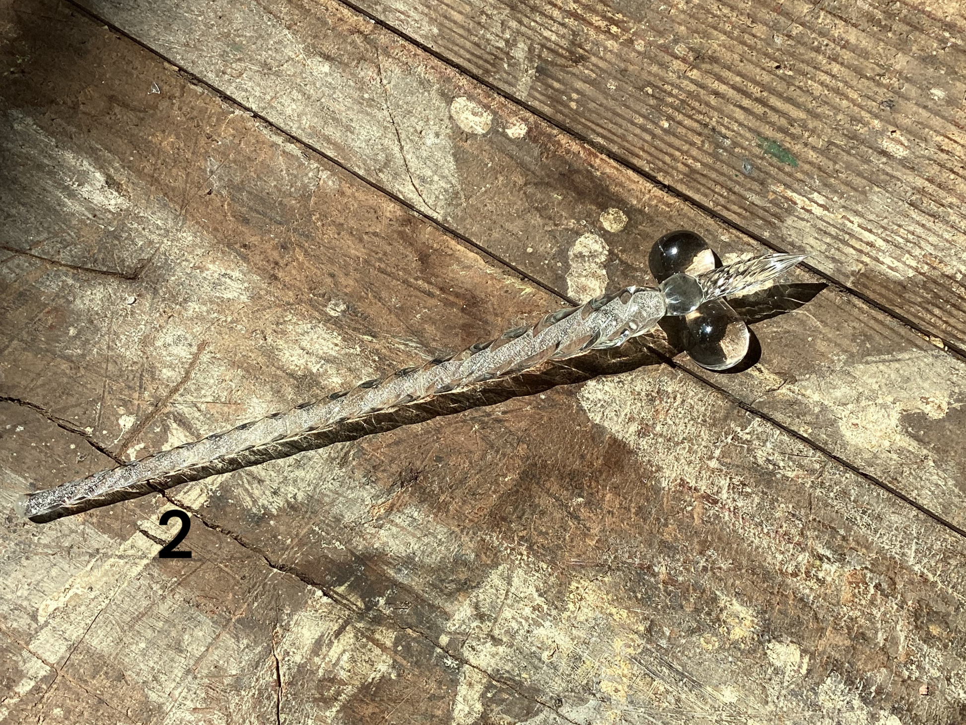 This glass dip pen is a writing instrument that is made entirely of glass, featuring a decorative handle and a twisted, grooved nib that holds ink through capillary action.