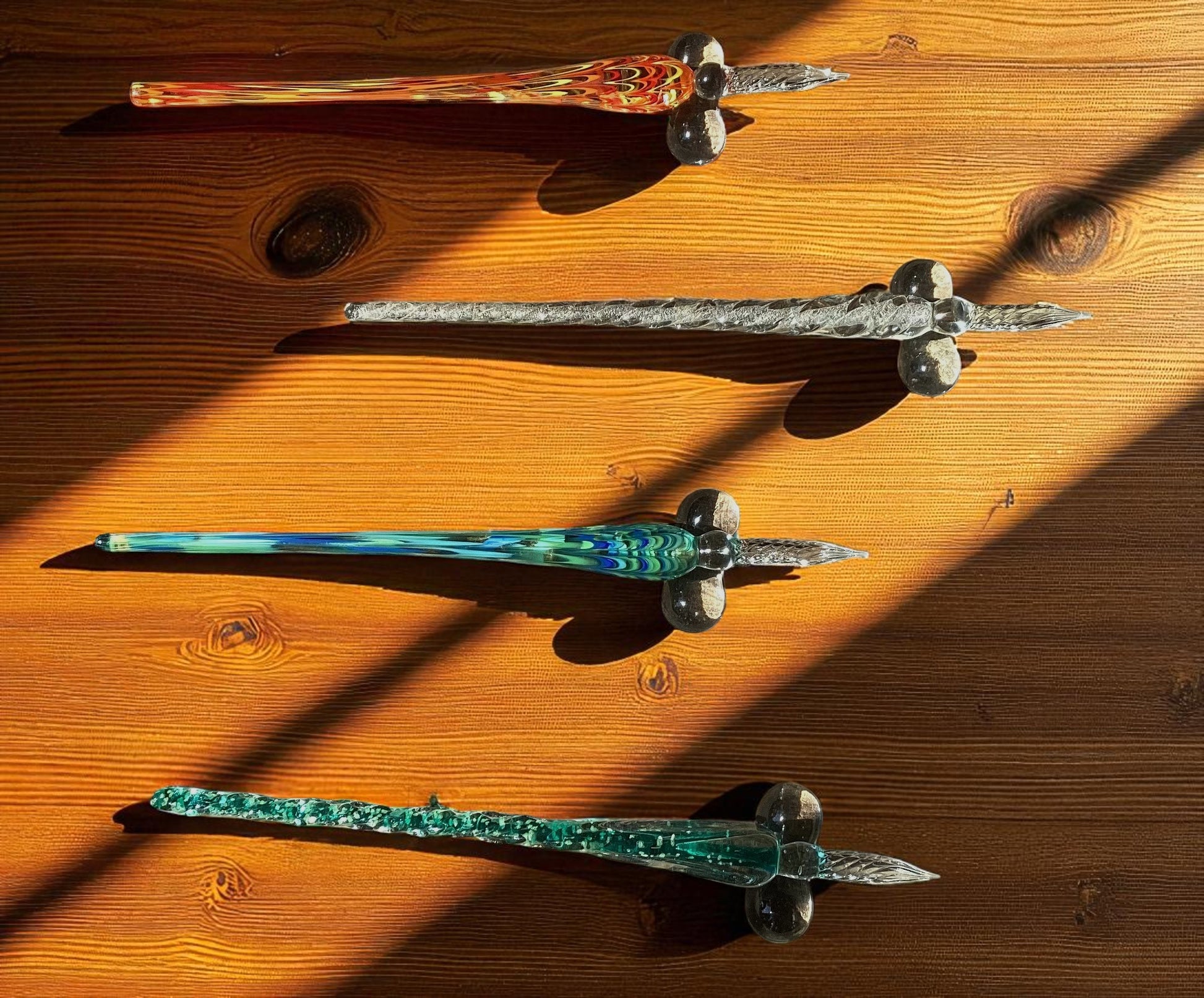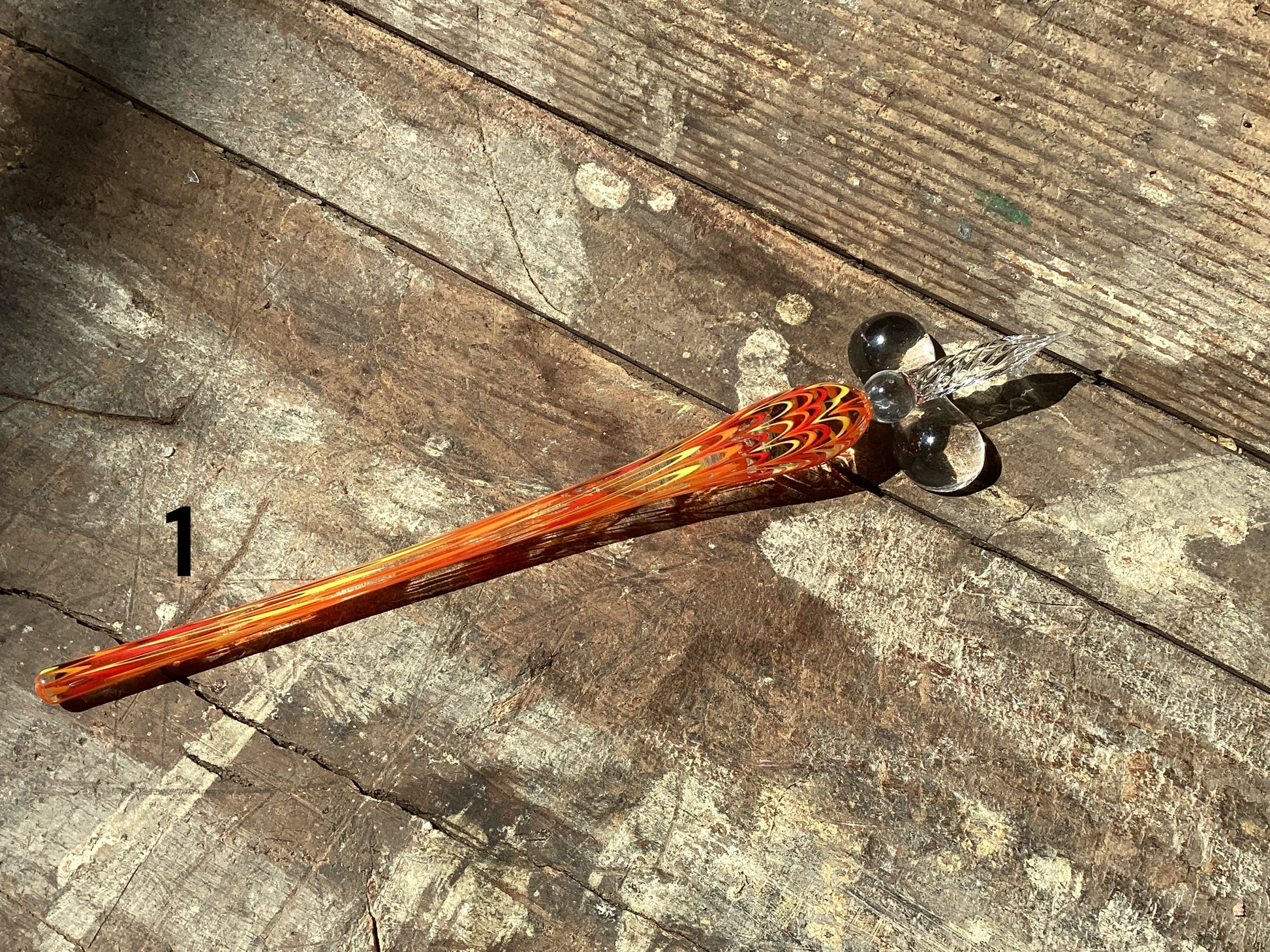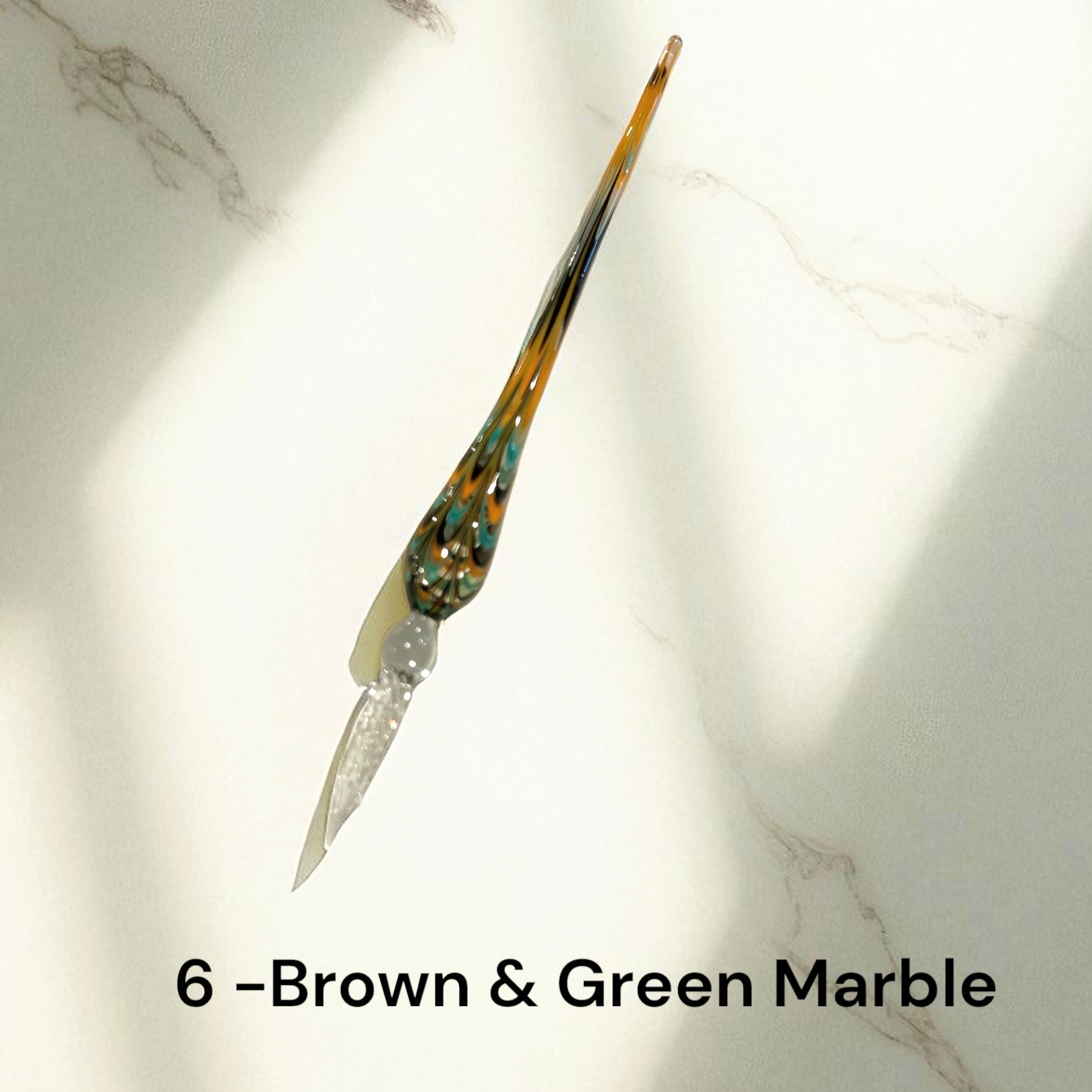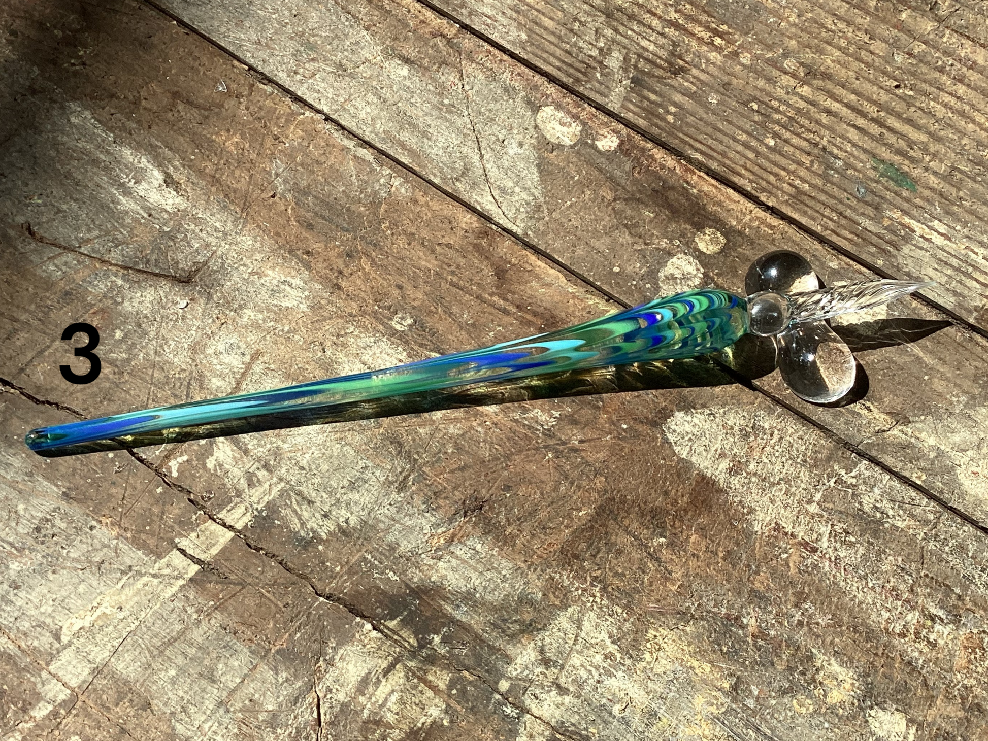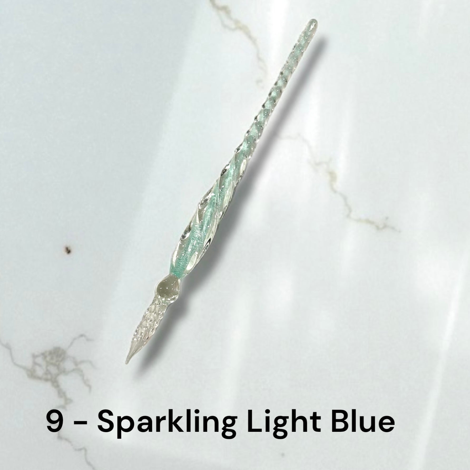 This glass dip pen is a writing instrument that is made entirely of glass, featuring a decorative handle and a twisted, grooved nib that holds ink through capillary action.