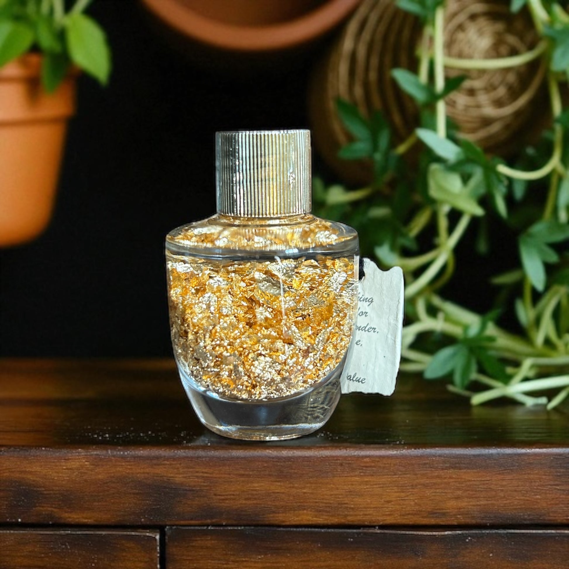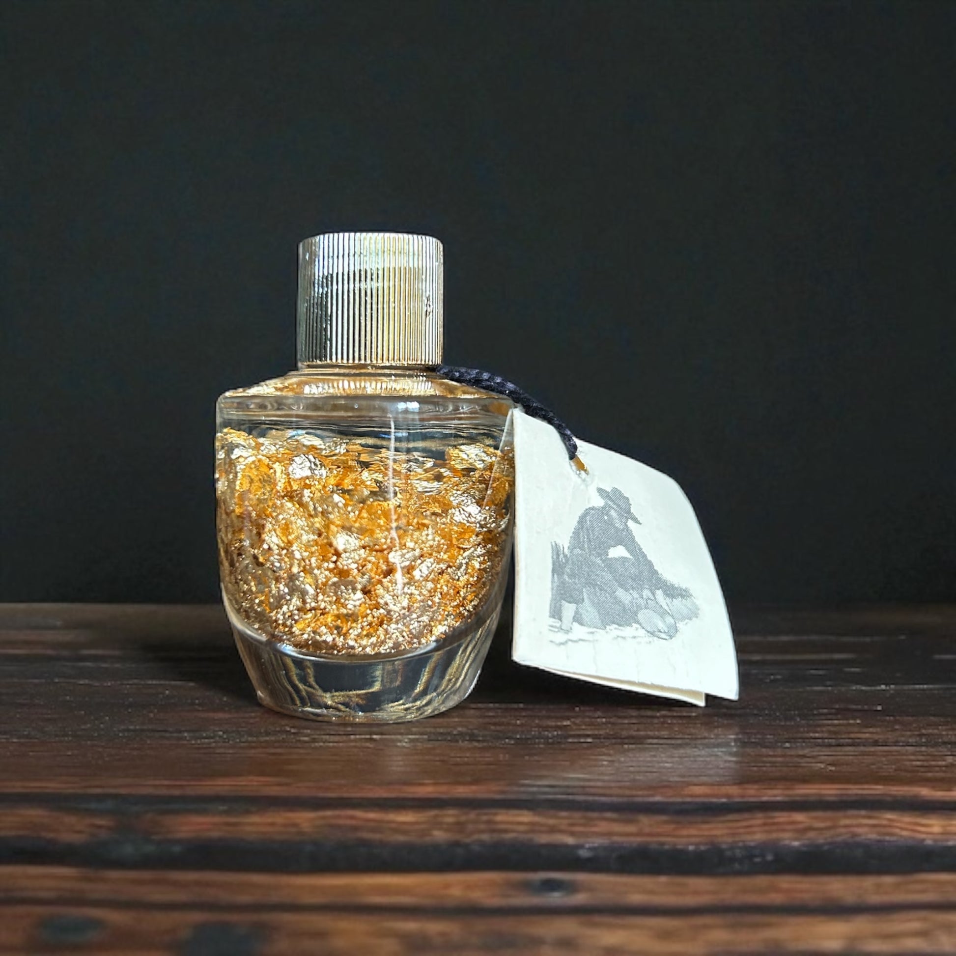 This glass bottle contains a suspension of high-purity gold leaf, visible as delicate metallic flakes dispersed evenly in a clear medium. The gold flakes measure just microns in thickness, showcasing gold’s remarkable malleability and brilliant luster.