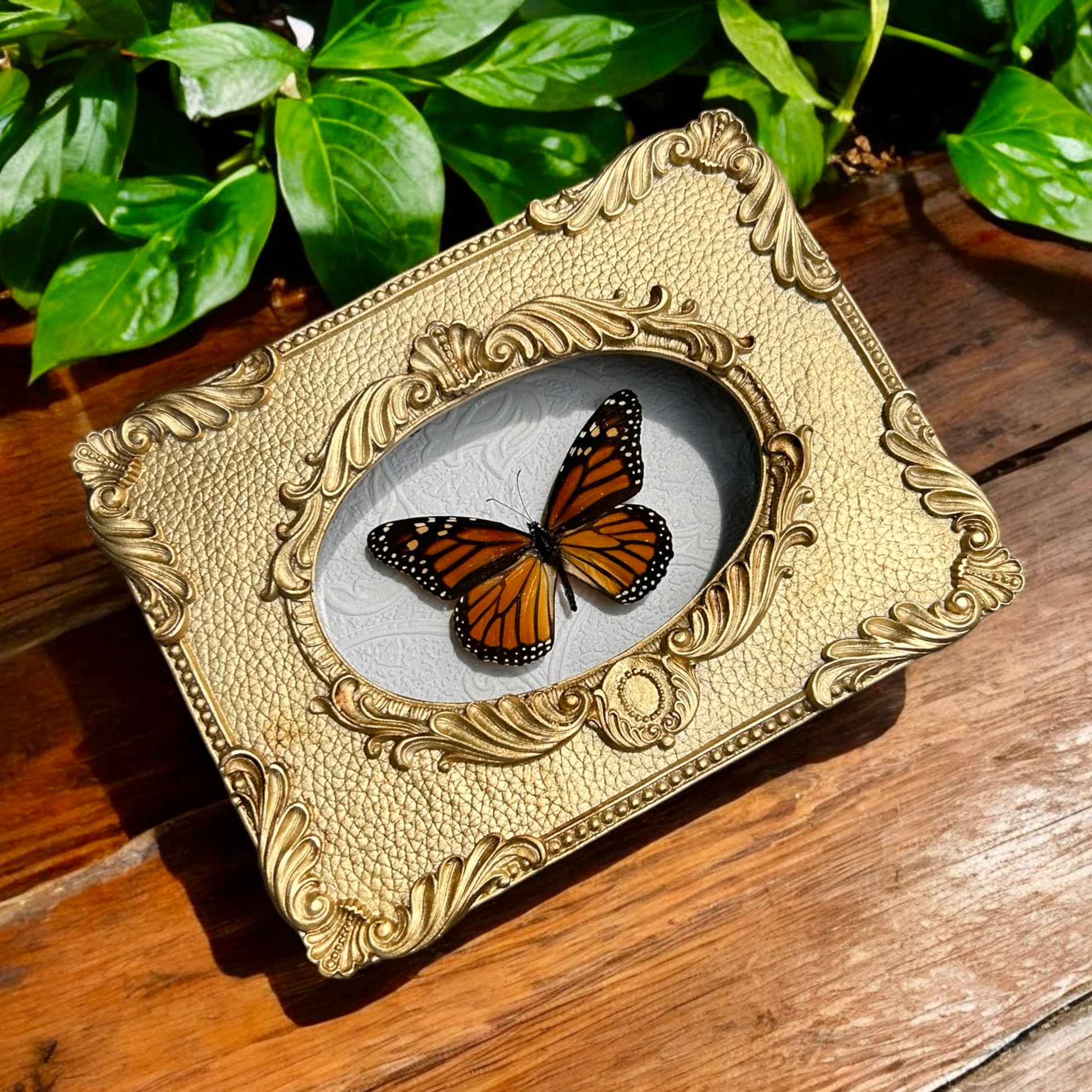 Real Monarch Butterfly displayed in a gold vintage frame.