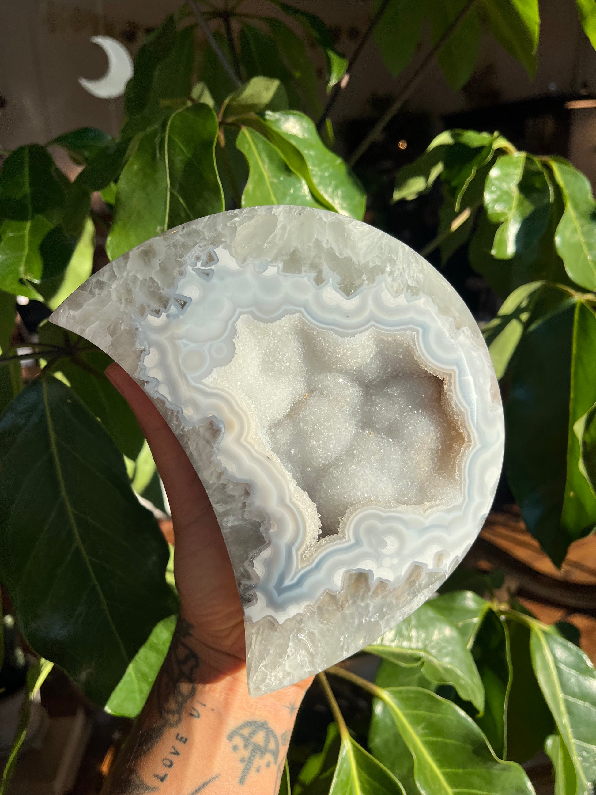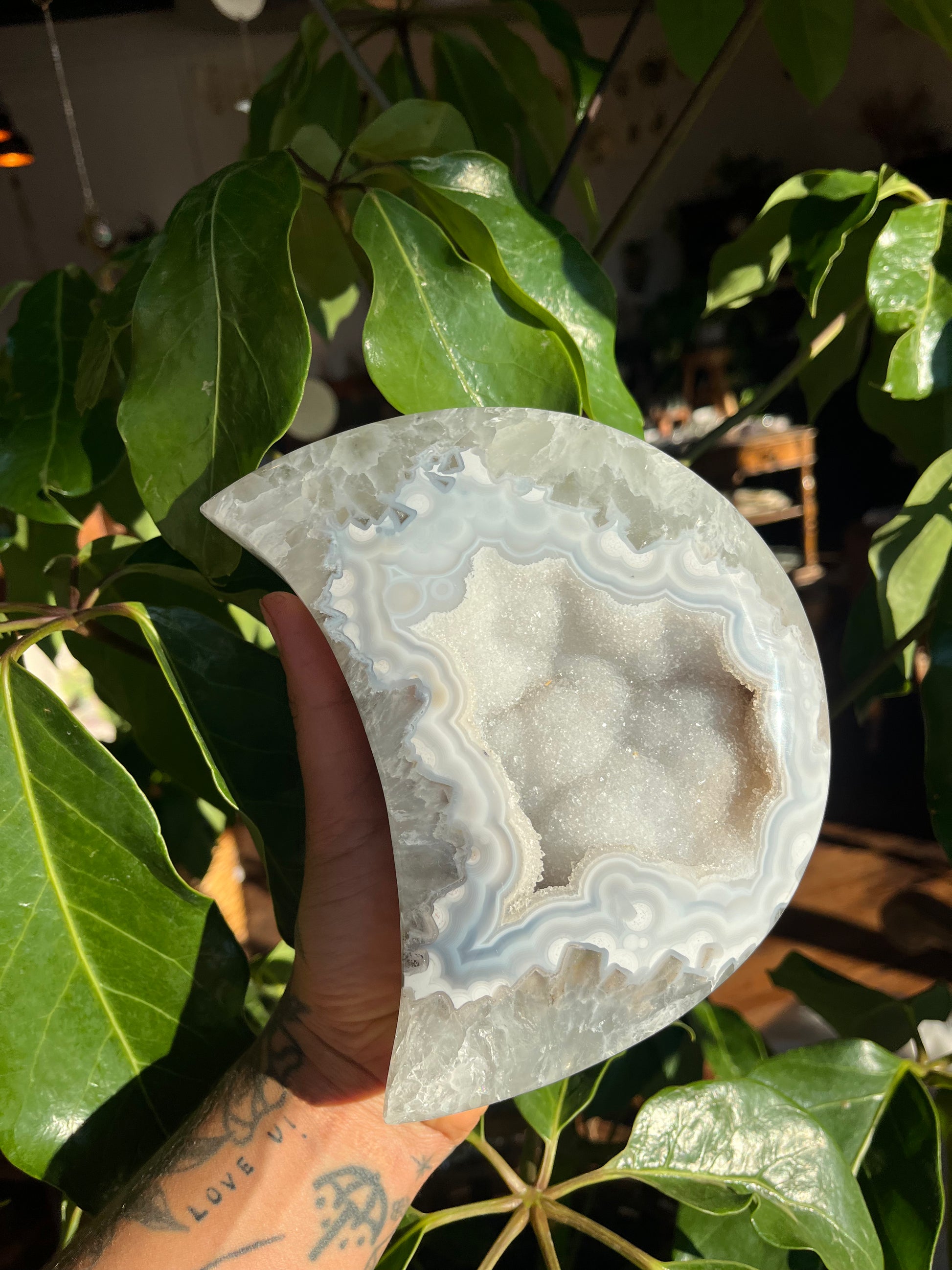 Illuminate your space with the enchanting beauty of our Druzy Crystal Moon. Shaped like a crescent moon and covered in a blanket of shimmering crystal clusters, this piece captures the magic of the night sky and channels it into your everyday life.