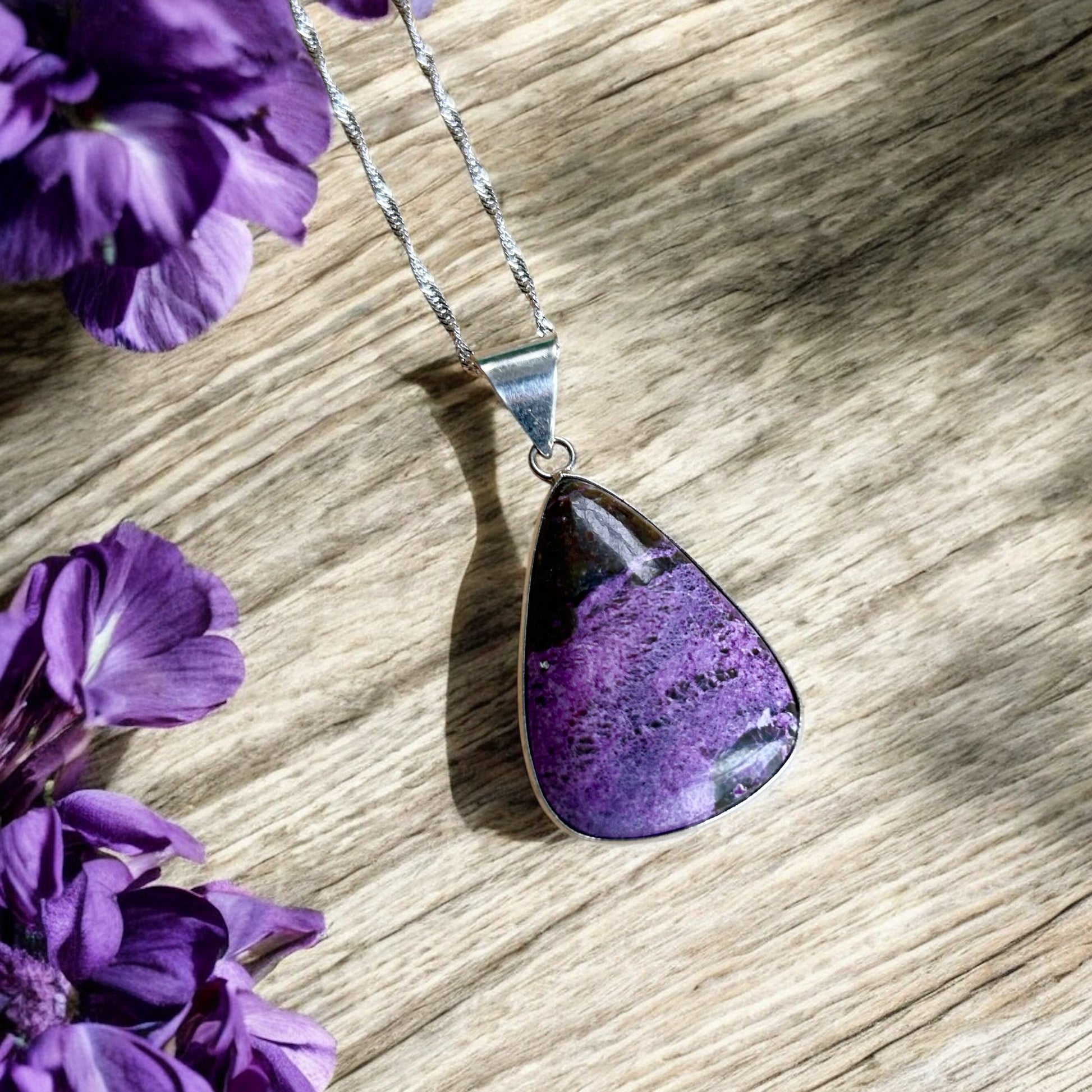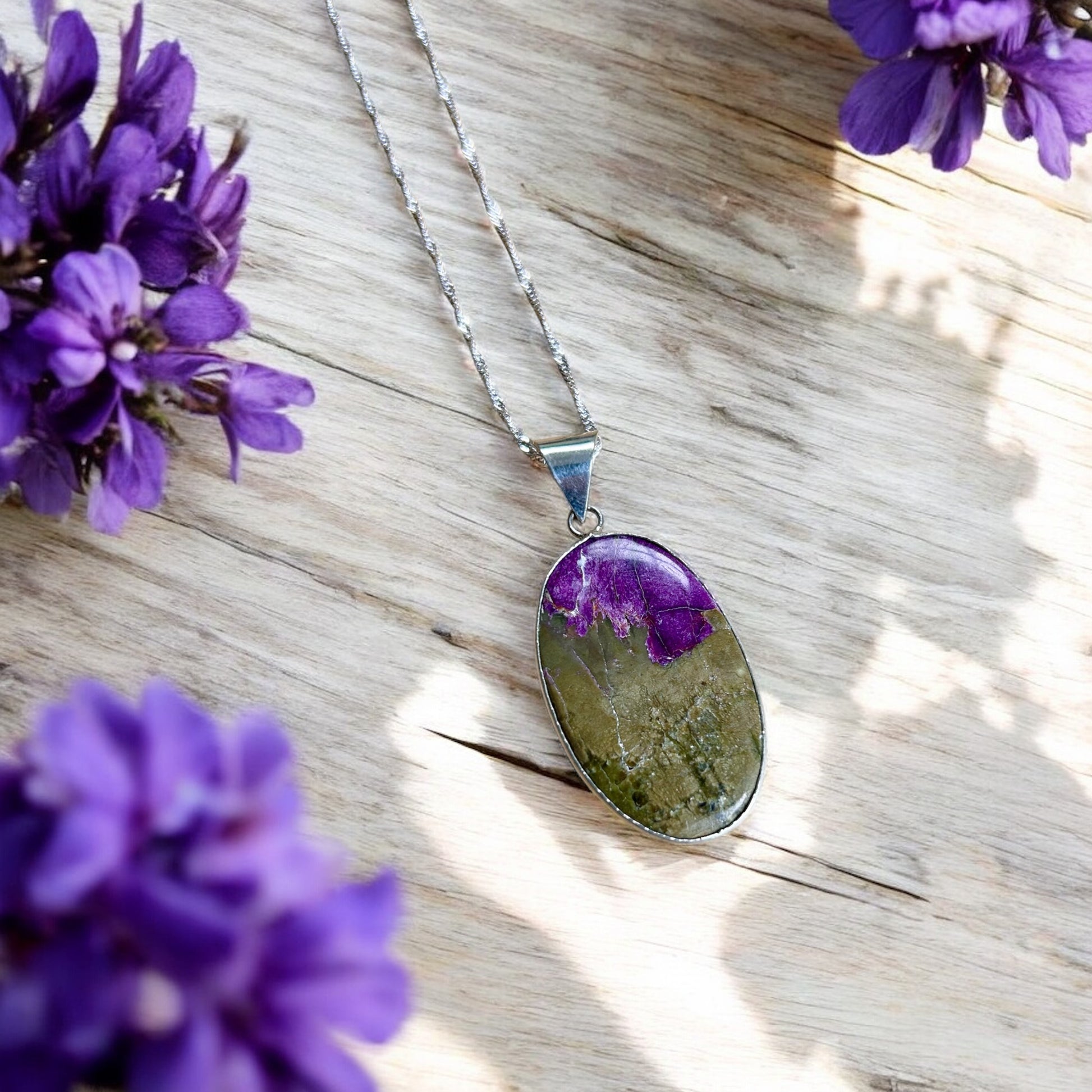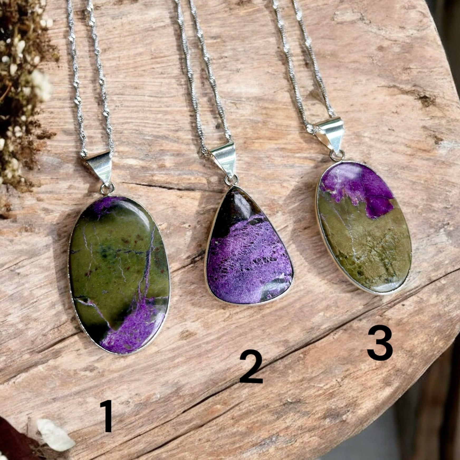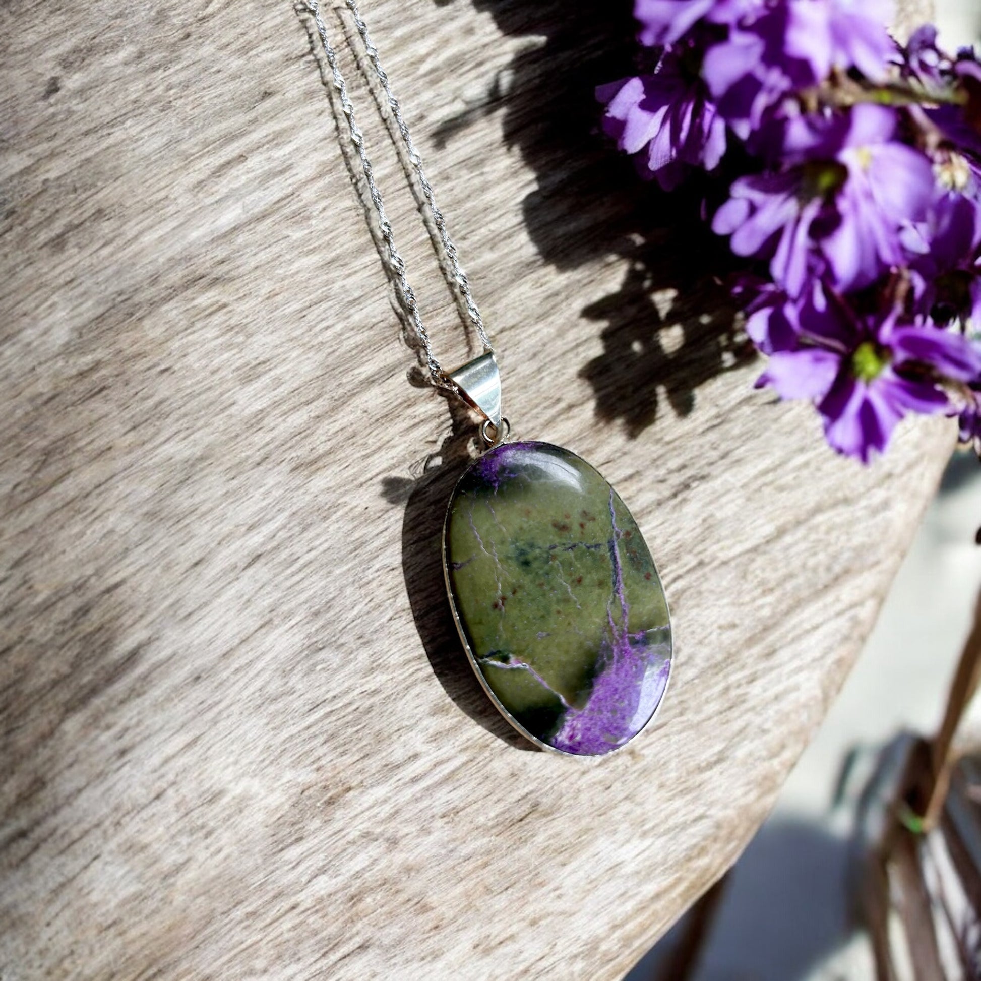 Genuine Stichtite Crystal: Known for its emotional healing and nurturing properties, Stichtite is a rare crystal often associated with peace, compassion, and heart chakra balancing. Each Stichtite stone showcases a distinctive mix of soft purples and earthy greens, making every necklace truly one-of-a-kind.