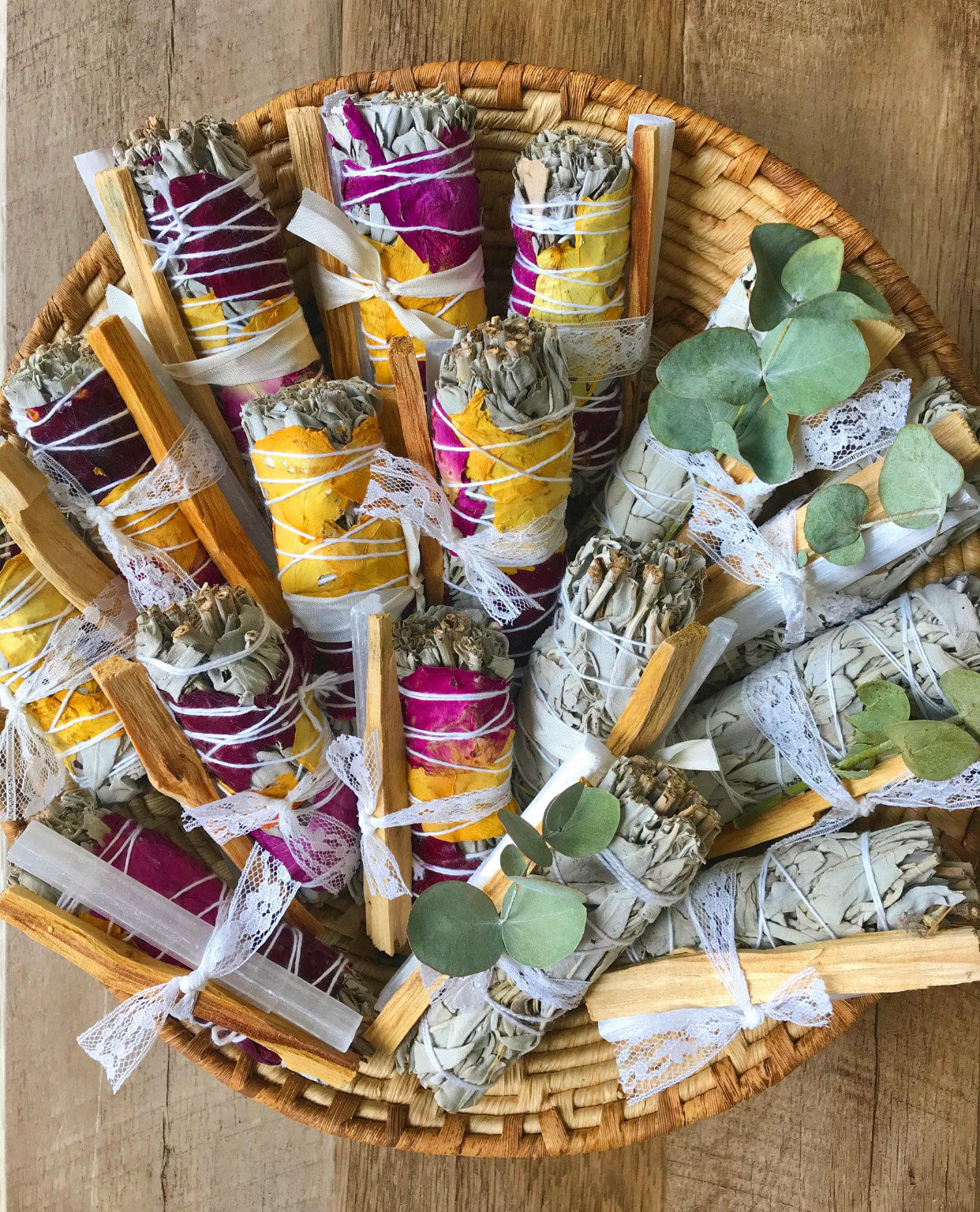 All smudge bundles come with White Sage & Rose for cleansing, a stick of sacred Palo Santo for purification, and a Selenite wand for protection.